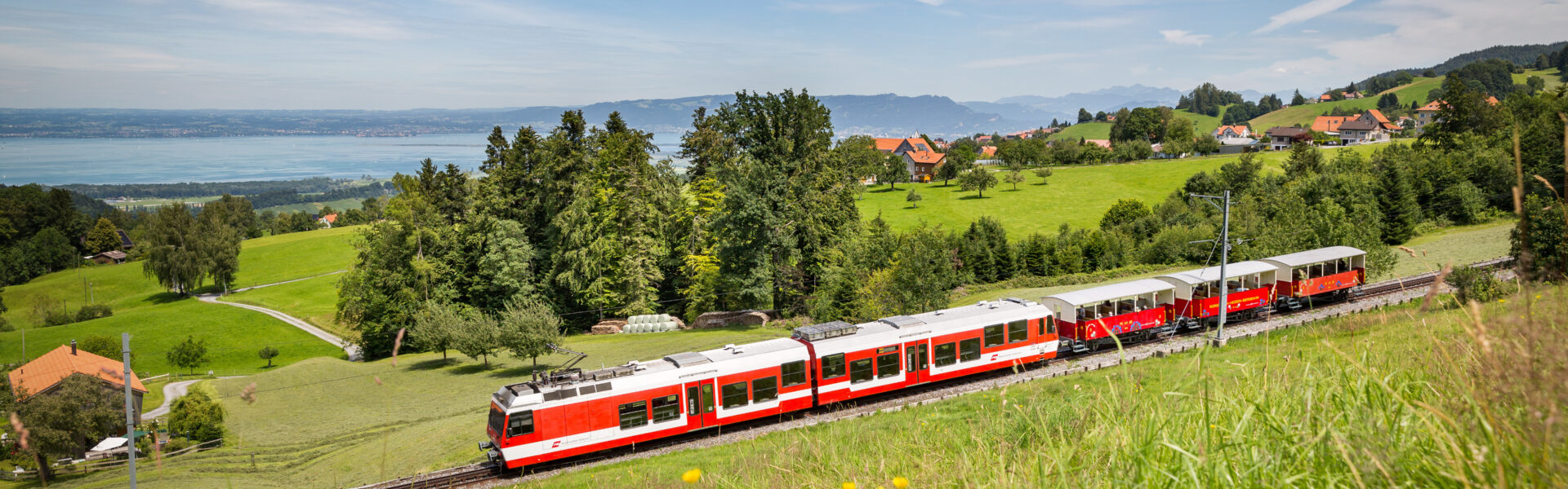 Das Appenzellerland überrascht Besucher durch seine Hügellandschaft mit schmucken Dörfern und durch die länderübergreifende Aussicht. Hier ist der FoodTrail auch fürs Auge ein Genuss. Einzigartig ist, dass schon die Anreise mit der Zahnradbahn ab Rorschach im FoodTrail-Preis inbegriffen ist. Du schaukelst also bequem mit der Zahnradbahn hinauf zum Startpunkt in Heiden und nach dem Trail wieder hinunter. An schönen Sommertagen bietet die Bahn sogar offene Wagen. So fühlst du dich wie die Pioniere von früher, die hier die einzige Zahnradbahn mit Normalspur bauten.