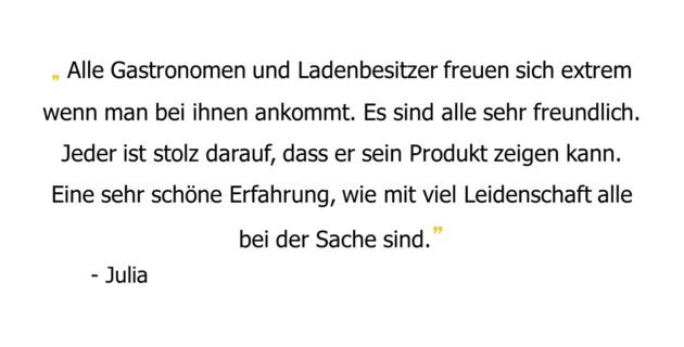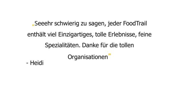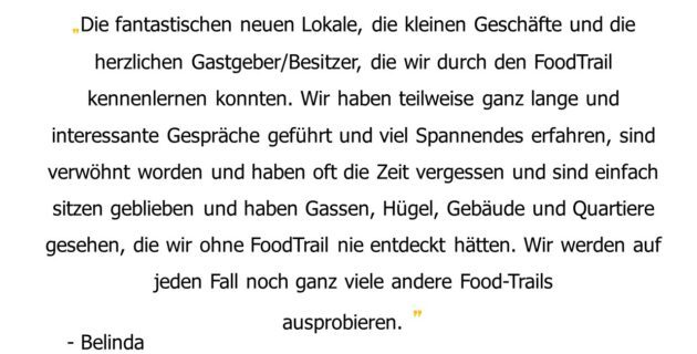 FoodTrails sind genussvolle Schnitzeljagden, die bleibende Erinnerungen schaffen. Bei einer Verlosung «Wähle deinen Lieblings-Trail» konnten uns die Teilnehmer ihre schönsten FoodTrail-Momente mitteilen. Gerne möchten wir eine Auswahl davon mit euch teilen.